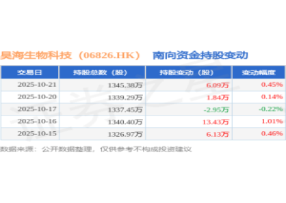 - 昊海生物科技(06826HK):10月21日南向资金增持609万股 2025-10-23