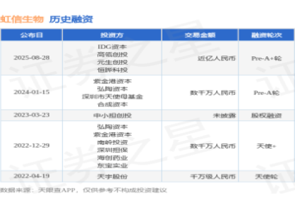 - 【投融资动态】虹信生物Pre-A+轮融资额近亿人民币投资方为IDG资本、高瓴创投 2025-09-02