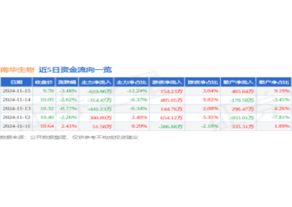 - 股票行情快报:南华生物(000504)11月15日主力资金净卖出61986万元 2024-11-16