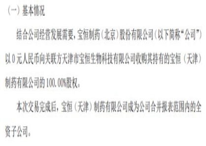 - 宝恒制药以0元向关联方天津市宝恒生物科技有限公司收购其持有的(天津)制药有限公司 2024-07-03