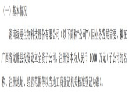 - 绿蔓生物拟投资1000万设立全资子公司龙胜绿蔓生物科技有限公司 2024-07-03